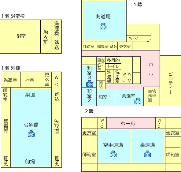 剣道場、ロッカールーム、師範室 管理事務所、会議室、食堂、浴室 更衣室、和室3室(宿泊可能50名) シャワー室 空手道場、柔道場、師範室、 ロッカールーム、シャワー室 弓道場、師範室、シャワー室 |